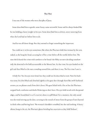 Short story exploring the perspective from one of the women disciples of Jesus.